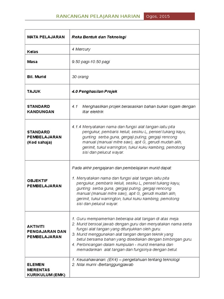 4 CEKAL MASA. T5 RANCANGAN PENGAJARAN HARIAN 2020 i-THINK 1 REKA BENTUK DAN TEKNOLOGI HARI SELASA TARIKH. Rancangan Pengajaran Harian yang dibina perlu merujuk kepada Rancangan Pengajaran Tahunan RPT Sukatan Pelajaran SP dan Huraian Sukatan Pelajaran HSP.